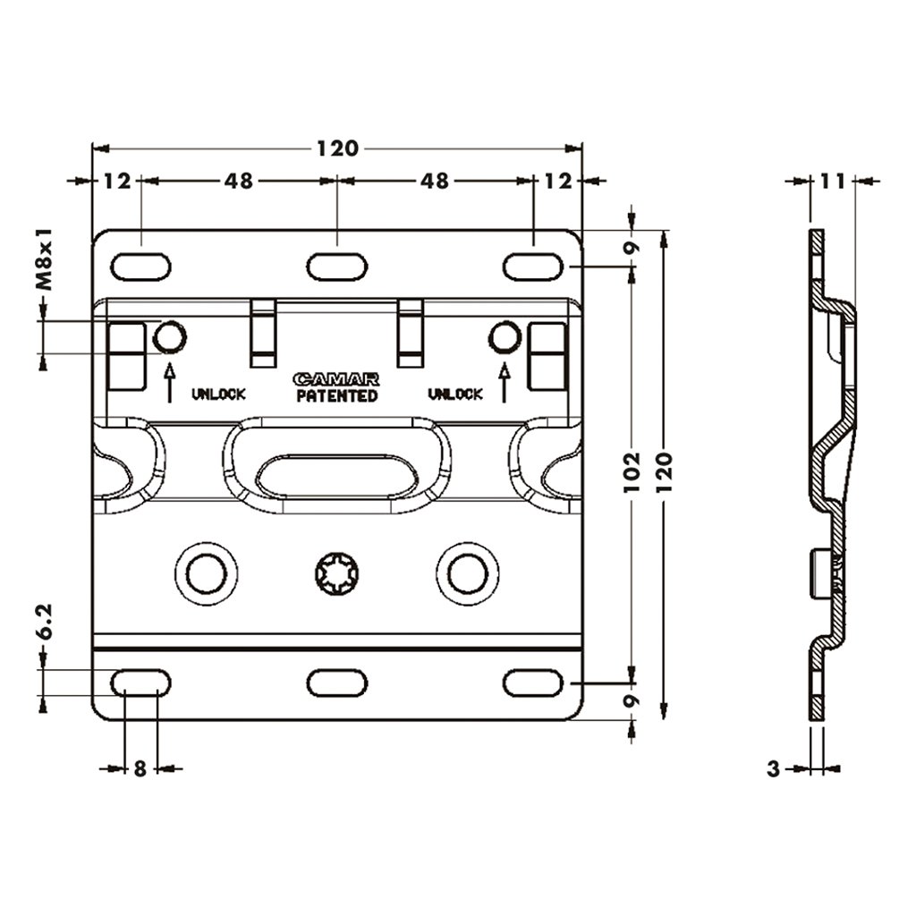 Spoľahlivá a pevná nosná platnička CAMAR je určená pre montáž závesu typu 807XL / 807XL RV na spodné skrinky. Vyrobená z pozinkovanej ocele zabezpečuje vysokú pevnosť a dlhodobú odolnosť voči korózii. Umožňuje presné a bezpečné uchytenie skrinky k stene, čím prispieva k stabilite a spoľahlivosti nábytkových riešení.