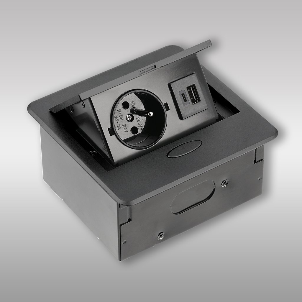 Kompaktná a elegantná výklopná zásuvka, ideálna pre moderné interiéry a menšie priestory. Poskytuje pohodlný prístup k elektrickej zásuvke a USB portom priamo na pracovnej ploche. Je vhodná pre domáce kancelárie, detské izby, kuchyne či pracovné ostrovy.