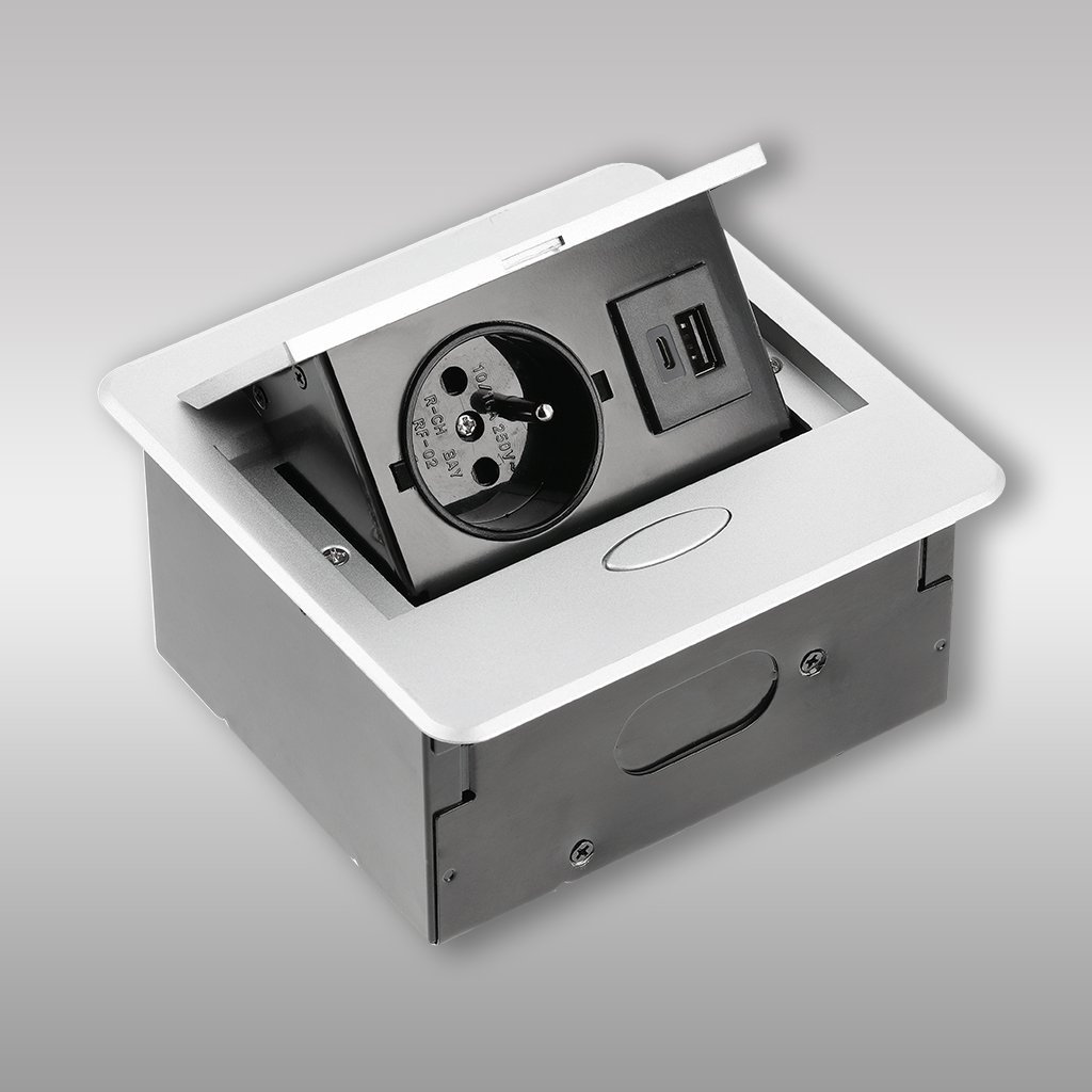 Kompaktná a elegantná výklopná zásuvka, ideálna pre moderné interiéry a menšie priestory. Poskytuje pohodlný prístup k elektrickej zásuvke a USB portom priamo na pracovnej ploche. Je vhodná pre domáce kancelárie, detské izby, kuchyne či pracovné ostrovy.