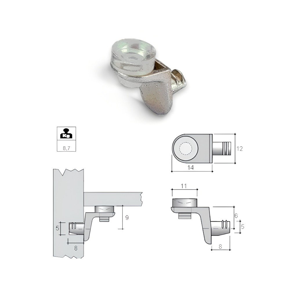 Hettich - Policová podperka - Sekura 8 - C na sklo je ideálnym riešením na nábytok pre bezpečné upevnenie sklenených políc. S priemerom čapu 5 mm je kompatibilná so štandardnými nábytkovými aplikáciami. Vyrobená z poniklovaného zinkového odliatku v kombinácii s transparentným plastom, zabezpečuje stabilitu a odolnosť. Táto podperka je špeciálne navrhnutá na pripevnenie sklenených políc, čo zvyšuje jej všestrannosť a estetickú hodnotu v moderných interiéroch.