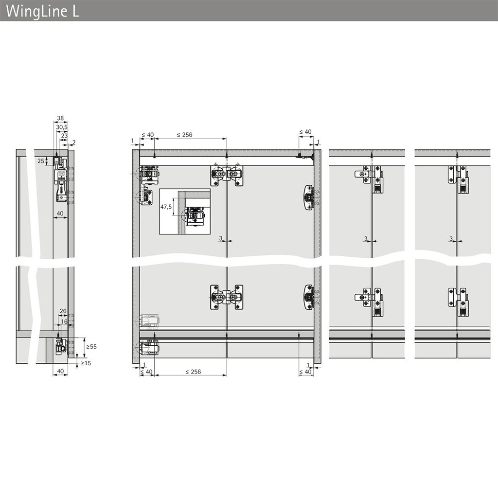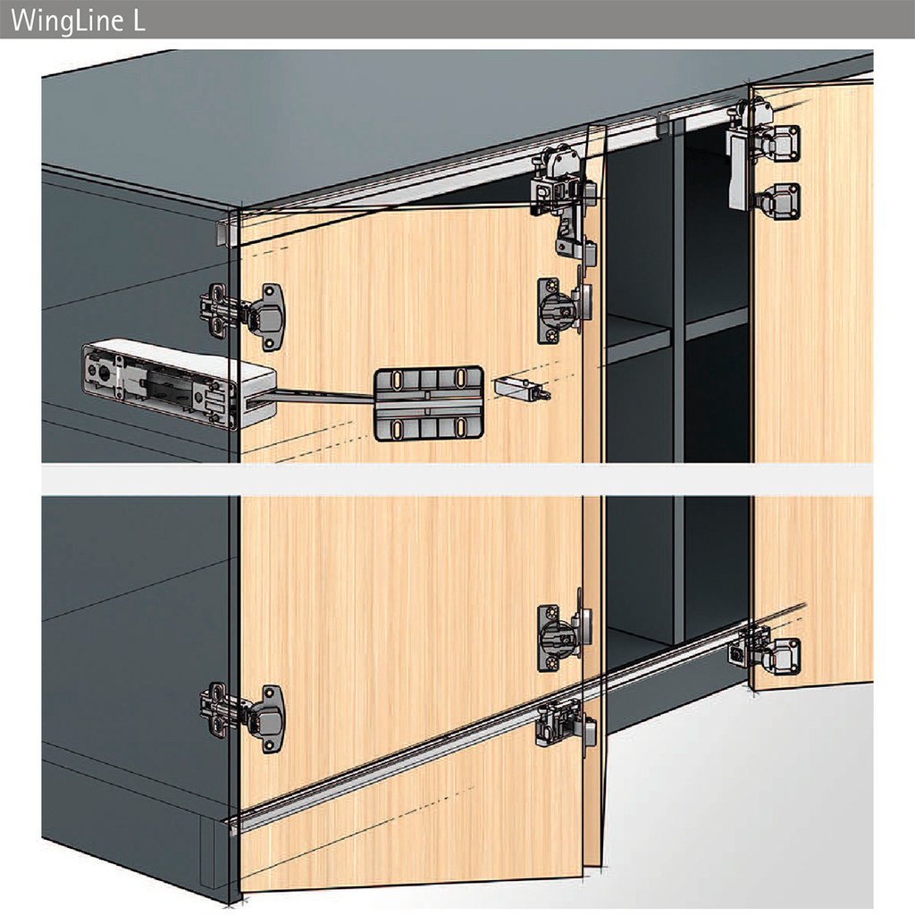 Stredový rýchlomontážny záves WingLine L je určený pre skladané nábytkové dvere s dvomi krídlami a zabezpečuje pevné, presné a spoľahlivé spojenie jednotlivých častí dverí. Vďaka rýchlomontážnemu systému je inštalácia jednoduchá a časovo úsporná, pričom nastaviteľná konštrukcia umožňuje presné doladenie výšky aj medzery medzi krídlami pre dokonalé lícovanie dverí.