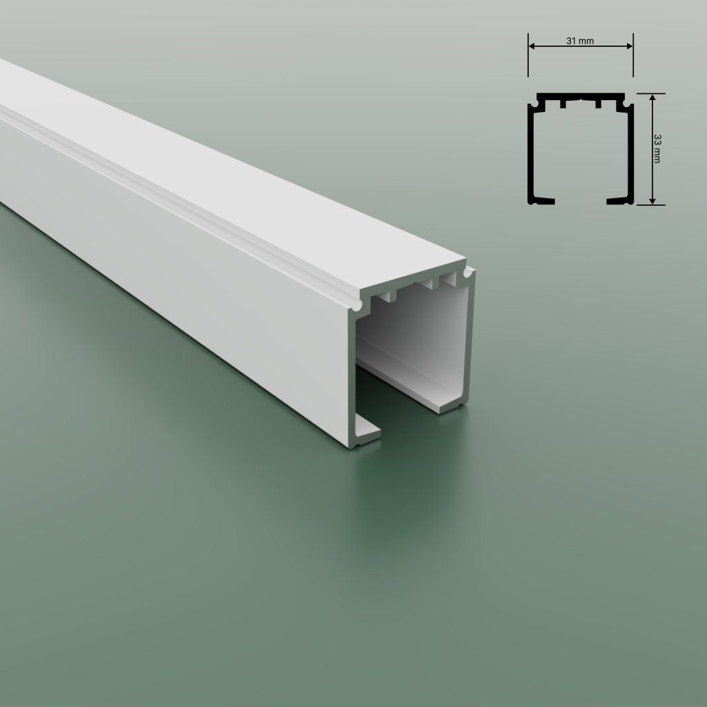 Dostupný v dĺžkach od 2 do 6 metrov, tento profil ponúka flexibilitu pri inštalácii a je možné ho prispôsobiť pre rôzne veľkosti dverí. So šírkou 33 mm a výškou 31 mm poskytuje profil pevné a stabilné vedenie pre vaše posuvné dvere.