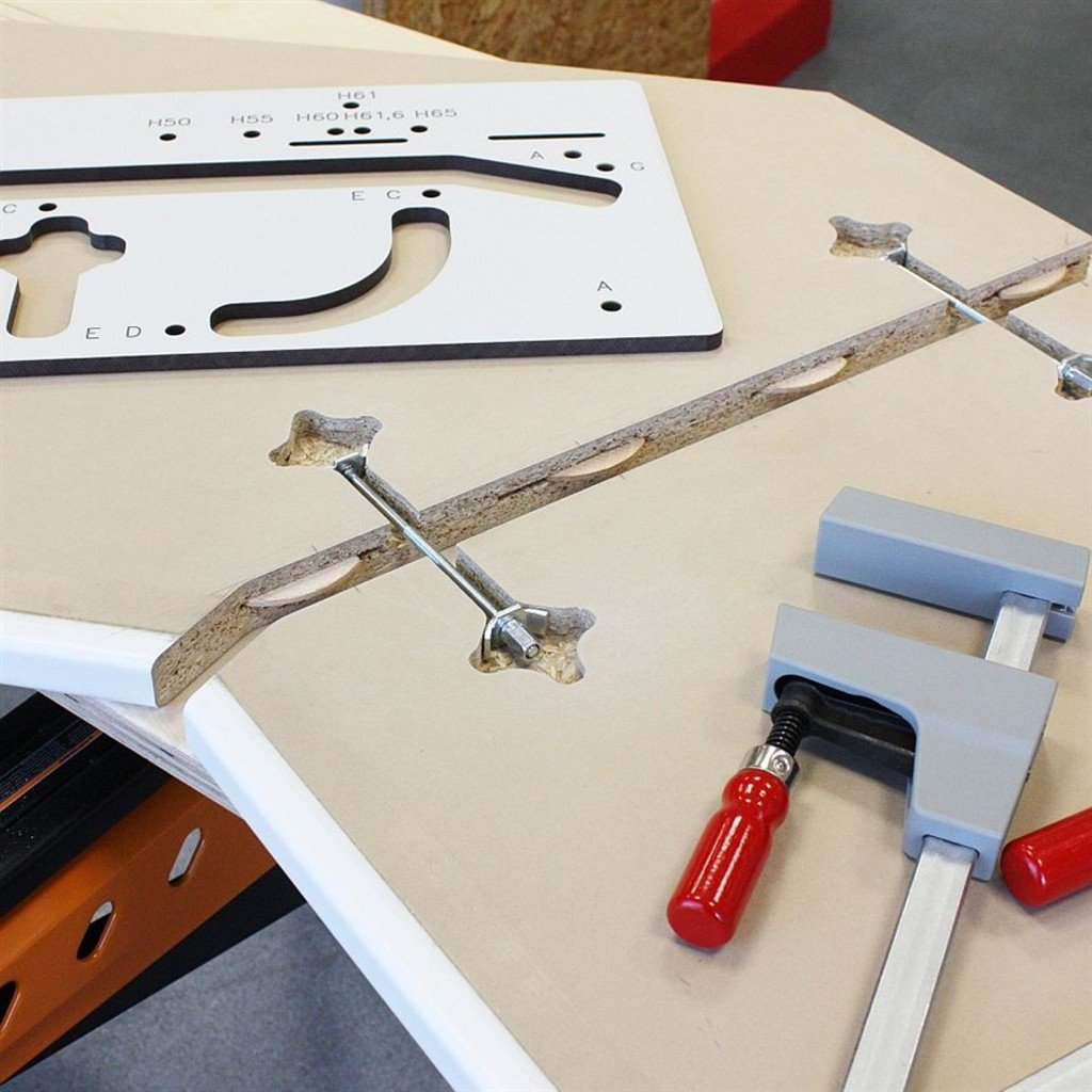 Šablóna IGM FK650 je určená na presné frézovanie spojov kuchynských pracovných dosiek pomocou všetkých typov horných frézok. Premyslený systém jasného značenia jednotlivých krokov výrazne zjednodušuje prácu, skracuje čas montáže a znižuje riziko chýb.
