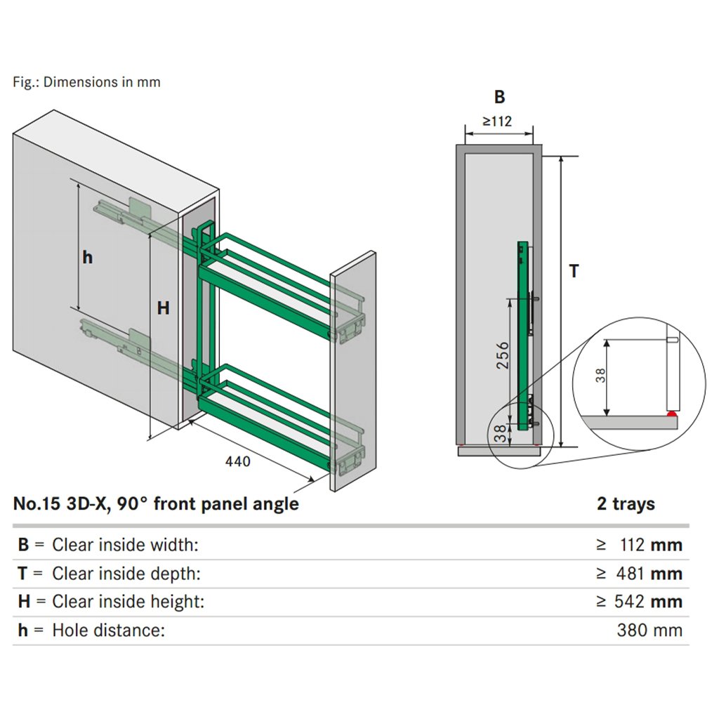 Systém je navrhnutý tak, aby tvoril jeden celok sám so sebou, je k dispozícii ako kompletný náklad s dvoma integrovanými policami. Každá z políc má textúrované dno, ktoré má protišmykovú funkciu, a bočné steny sú ukončené tromi okrúhlymi lištami. Cargo má dve vodiace lišty, ktoré sú vždy namontované na pravej strane tela skrinky, čo navyše zaisťuje väčšiu stabilizáciu systému. Hlavný mechanizmus je vybavený adaptérmi, ktoré pomáhajú pripevniť rám k vodidlám a uľahčujú nastavenie prednej časti v troch rovinách bez nutnosti demontáže systému. Celkové zaťaženie tohto veľmi úzkeho zdvihu je veľmi vysoké a predstavuje 12 kg (vlastná hmotnosť mechanizmu s prednou + nosnosťou), zatiaľ čo zaťaženie jedného koša je až 6 kg.