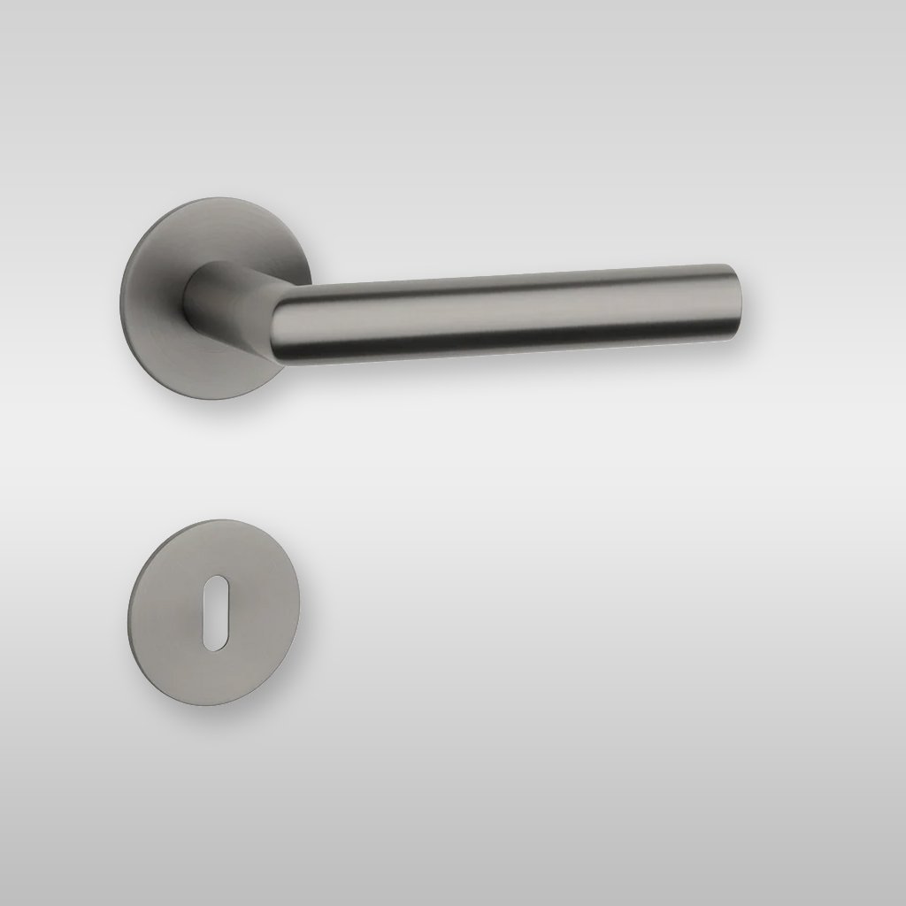 Kľučka je vyrobená z odolnej nehrdzavejúcej ocele s precíznou matnou grafitovou povrchovou úpravou, ktorá zaručuje dlhú životnosť, vysokú odolnosť voči opotrebeniu a jednoduchú údržbu. Extra tenká okrúhla rozeta s hrúbkou iba 3 mm pôsobí veľmi subtílne a podčiarkuje moderný charakter dverí.