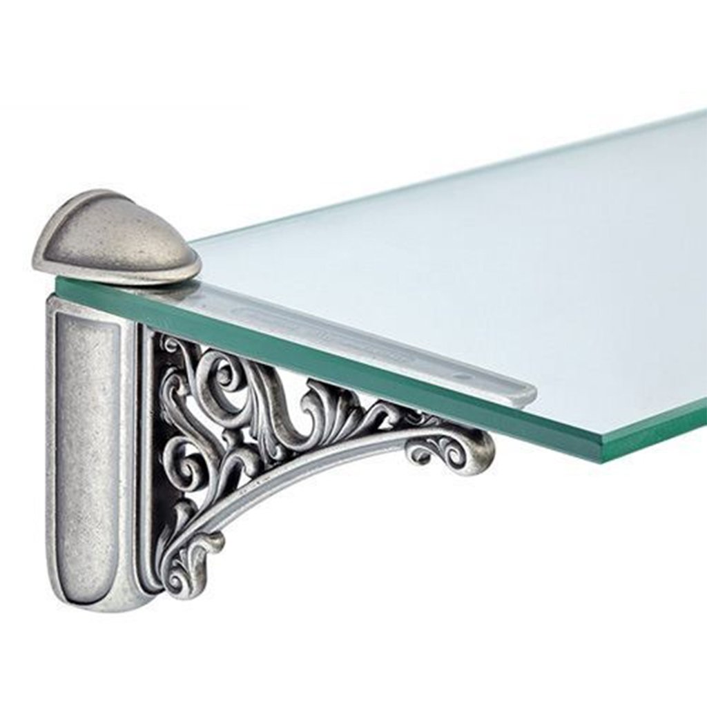 Konzola policová BAROCCO, Starooceľ je elegantným a funkčným doplnkom pre sklenené police, ktoré dokonale zapadnú do vintage interiérov. Vyznačuje sa robustným železným materiálom v povrchovej úprave starooceľ. Nosnosť konzoly je 40 kg, čo umožňuje bezpečnú montáž políc s minimálnou hĺbkou 120 mm a hrúbkou od 2 do 40 mm. Tento dizajnový prvok pridáva šarm do každej miestnosti, kde sa využíva kombinácia starožitného vzhľadu a modernej funkčnosti.