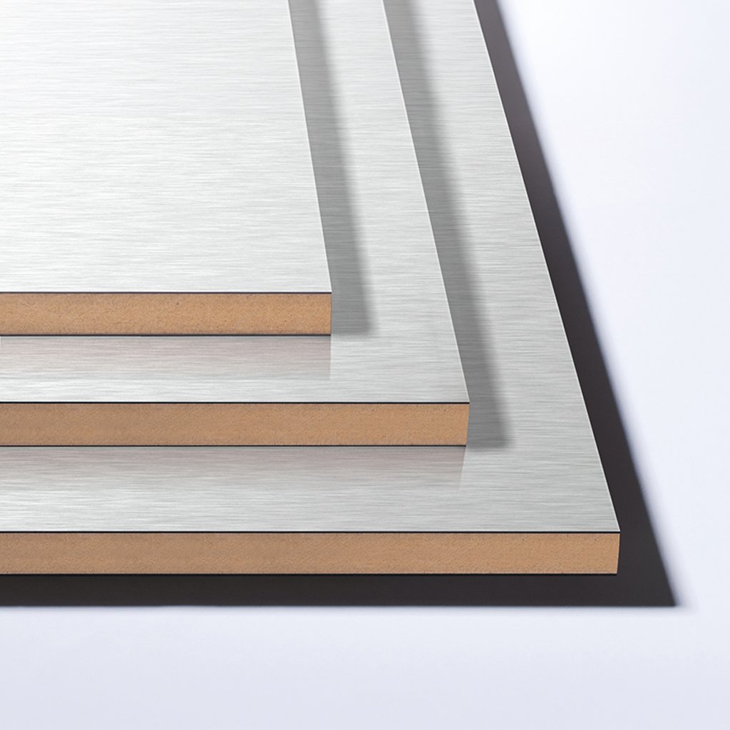 Moderná MDF doska s pravým hliníkovým povrchom pre interiéry, kde je požadovaný technický vzhľad, vysoká odolnosť a precízne spracovanie.