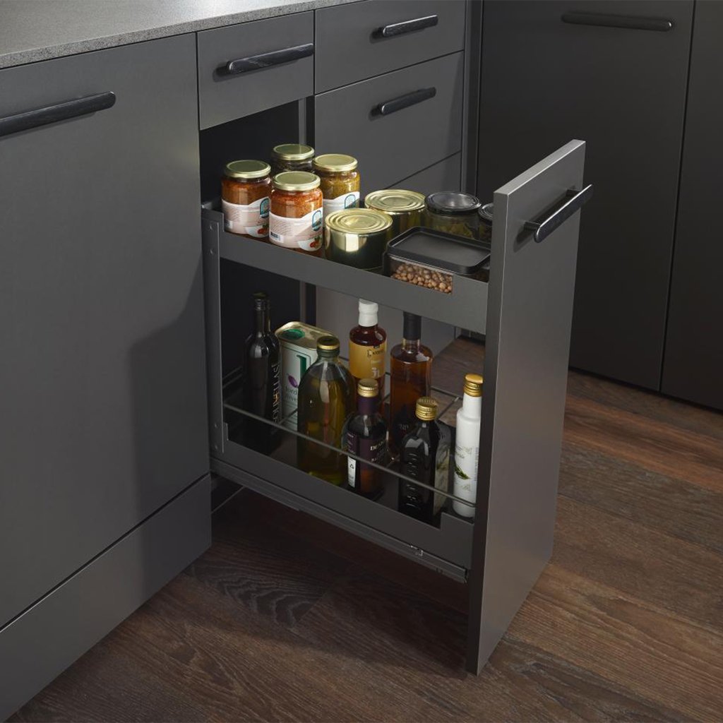 Kuchynský výsuv Pinello Cargo je ideálnym riešením pre úzke kuchynské skrinky, kde poskytuje praktický, prehľadný a ľahko dostupný úložný priestor.