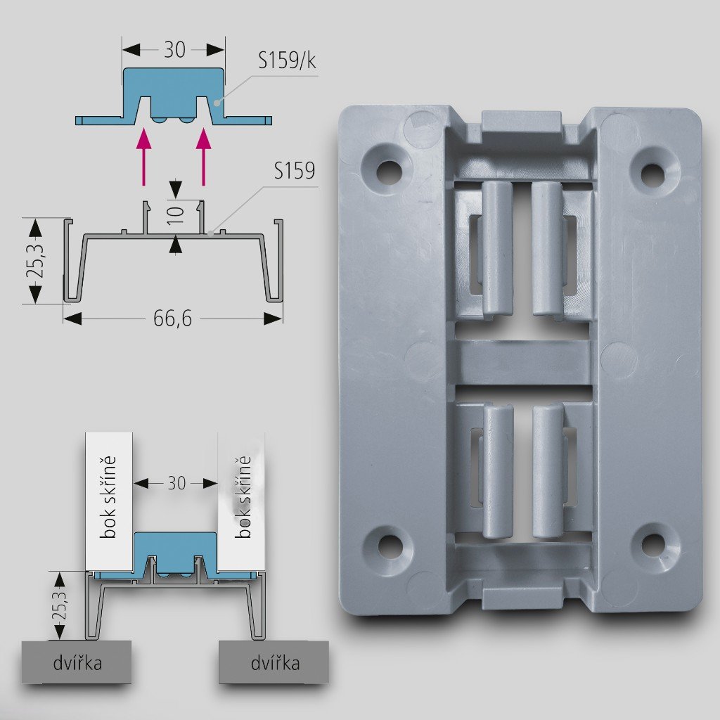 S159/k - montážny klip k zvislému úchytovému obojstrannému profilu S159. Materiál plast, cena je za 1 ks. Unikátny systém jednoduchej montáže profilov pomocou klipov. Doporučené množstvo klipov - 1 x spodné uchytenie, 1 x horné uchytenie, 1 x pre každý ďalší 1m dĺžky. (t.j. pre 3-metrový profil sú potrebné 4 ks klipu S159/k).