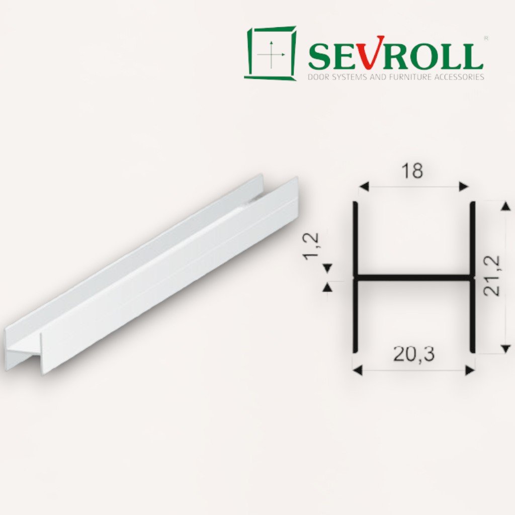 Spojovací H profil SEVROLL H21 s dĺžkou 3 m je určený pre systém Simple s hrúbkou 18 mm. Tento profil slúži na spojenie jednotlivých častí posuvných dverí bez potreby skrutkovania, čo zabezpečuje jednoduchú montáž a pevné spojenie.