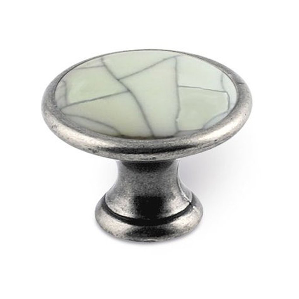 Rustikálna knopka SIRO kombinuje kov a keramiku v elegantnom tradičnom prevedení. Kovová základňa v povrchovej úprave starostriebro s jemnou patinou vytvára autentický starožitný vzhľad. Horná časť je doplnená keramickým prvkom s jemným popraskaným glazúrovaným efektom, ktorý dodáva knopke jedinečný dekoratívny charakter.