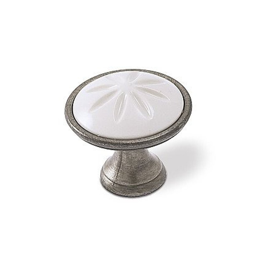 Stred knopky je ozdobený svetlou plastovou vložkou s reliéfnym motívom pripomínajúcim kvet alebo hviezdicu. Tento dekoratívny prvok podčiarkuje klasický štýl a vytvára jemný vizuálny akcent. Knopka je ideálnou voľbou pre klasické, vidiecke alebo rustikálne interiéry, kde doplní skrinky, zásuvky či komody.