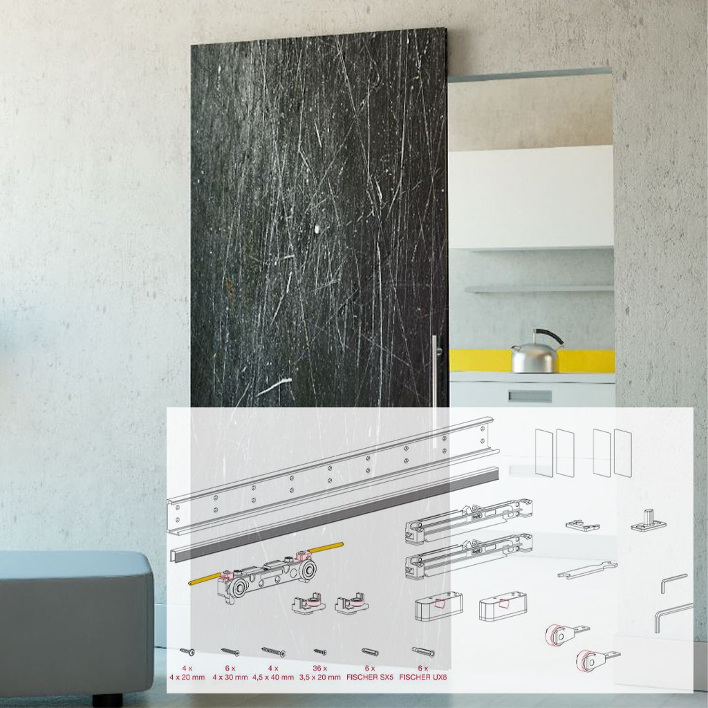 TERNO Magic2/1800 je neviditeľný posuvný systém pre jednokrídlové drevené dvere, ktorý poskytuje tiché a plynulé zatváranie vďaka obojstrannému tlmeniu. Systém sa montuje na stenu, pričom vodiaca koľajnica je skrytá za dverami, čo vytvára moderný a minimalistický vzhľad.