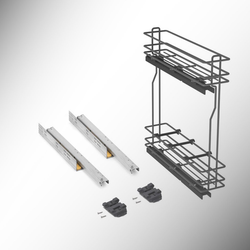 TitaneMax Cargo 150 je praktický a elegantný výsuvný systém určený pre kuchynské skrinky. Je ideálny na uskladnenie fliaš a drobných kuchynských potrieb vďaka dvom košom a trom deliacim priehradkám v spodnom koši. Tento výsuvný systém je navrhnutý pre jednoduchú montáž a maximálnu funkčnosť.
