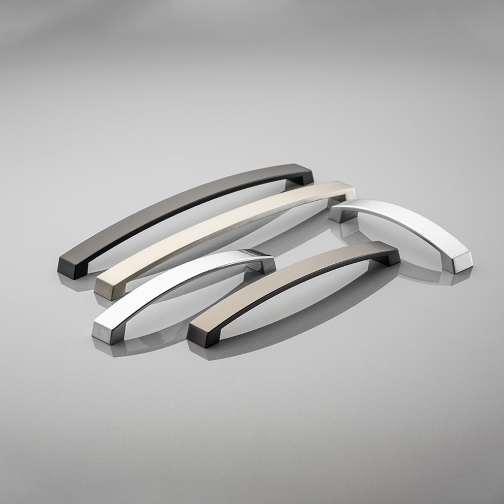 Vyznačuje sa geometrickými, šikmo nastavenými nožičkami a zaoblenou časťou pre pohodlné uchopenie. Vďaka univerzálnemu dizajnu a piatim farebným prevedeniam – chróm, hliník, brúsená oceľ, titán a čierna matná – sa úchytka hodí ku každému typu nábytkového frontu.