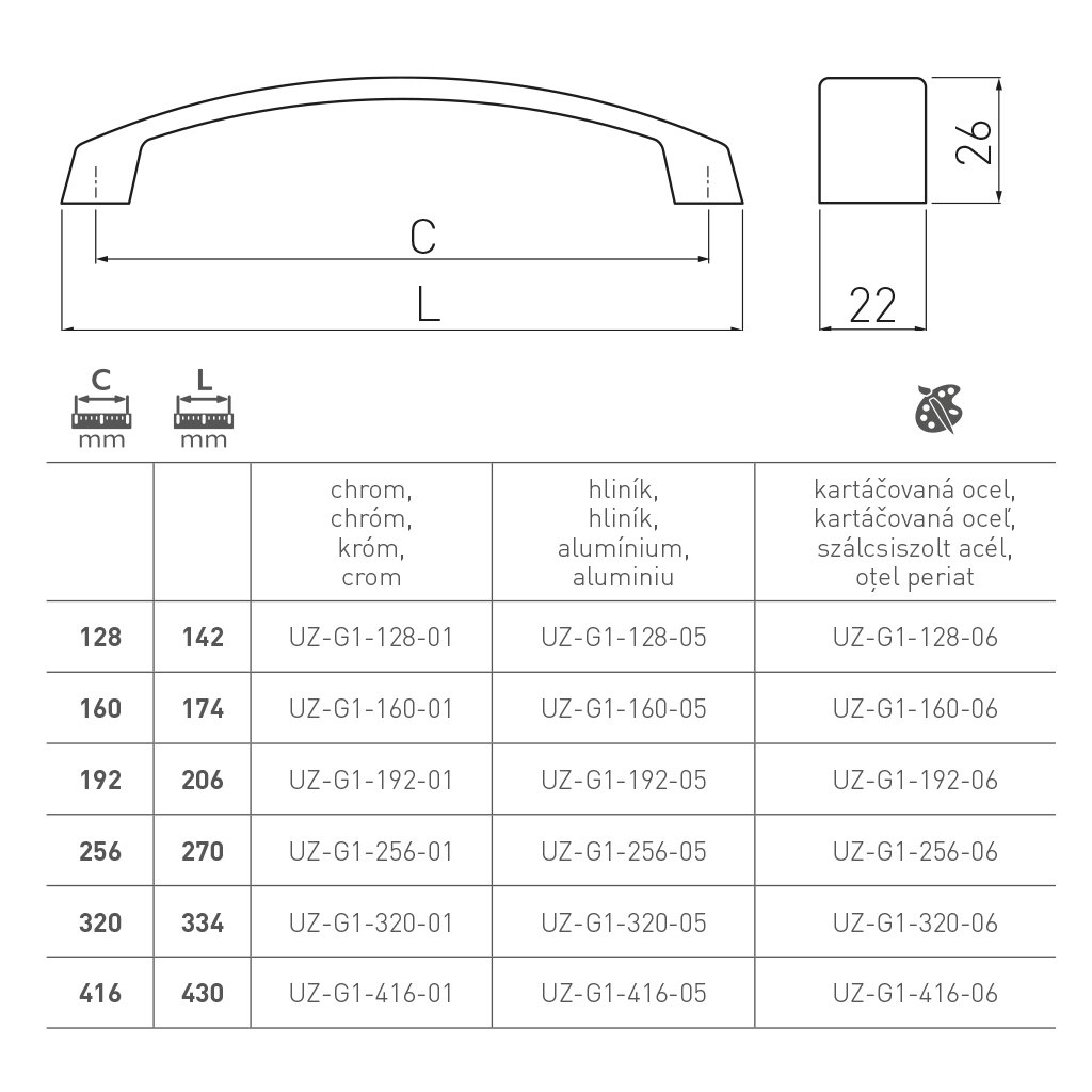 UZ – G1 je jednoduchá vkusná rukoväť s jemným ohybom. Je výborným doplnkom k čelám kancelárskeho, kuchynského a obývacieho nábytku. Jeho špeciálnym znakom sú geometrické nožičky postavené pod uhlom a zaoblená časť zábradlia. Univerzálny dizajn a povrchová úprava v piatich farebných prevedeniach: chróm, hliník, brúsená oceľ, titán a čierna matná sa hodí na akýkoľvek typ čiel. Má až osem rozstupov od 128 mm do 416 mm. Jeho tvar umožňuje vertikálnu aj horizontálnu montáž, čo pridáva na jeho univerzálnosti.