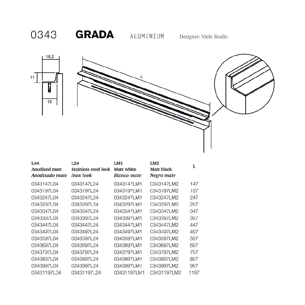 Úchytka GRADA je vyrobená z kvalitného hliníka a dostupná v 14 rôznych veľkostiach, čo umožňuje prispôsobiť ju rôznym typom nábytku. Ponúka sa v niekoľkých povrchových úpravách – elox matný, elox lesklý, nerezový vzhľad, čierna a biela – vďaka čomu ľahko zapadne do akéhokoľvek štýlu interiéru.