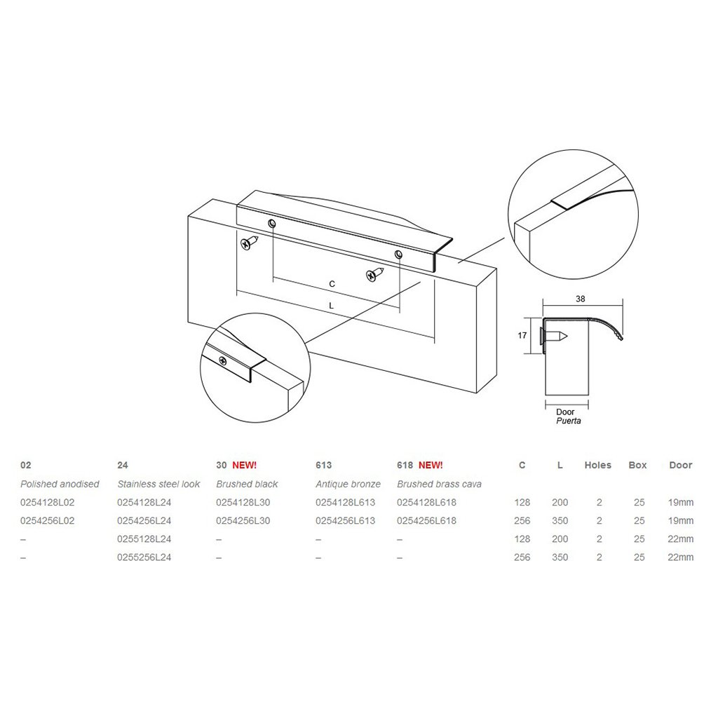 K dispozícii je v prevedeniach leštený eloxovaný hliník, nerezový look starožitný bronz a brúsená čierna. Novinkou je zlaté prevedenie „brúsená champagne“, ktoré váš nábytok ozvláštni nečakanou „iskrou“ a nádychom luxusu.