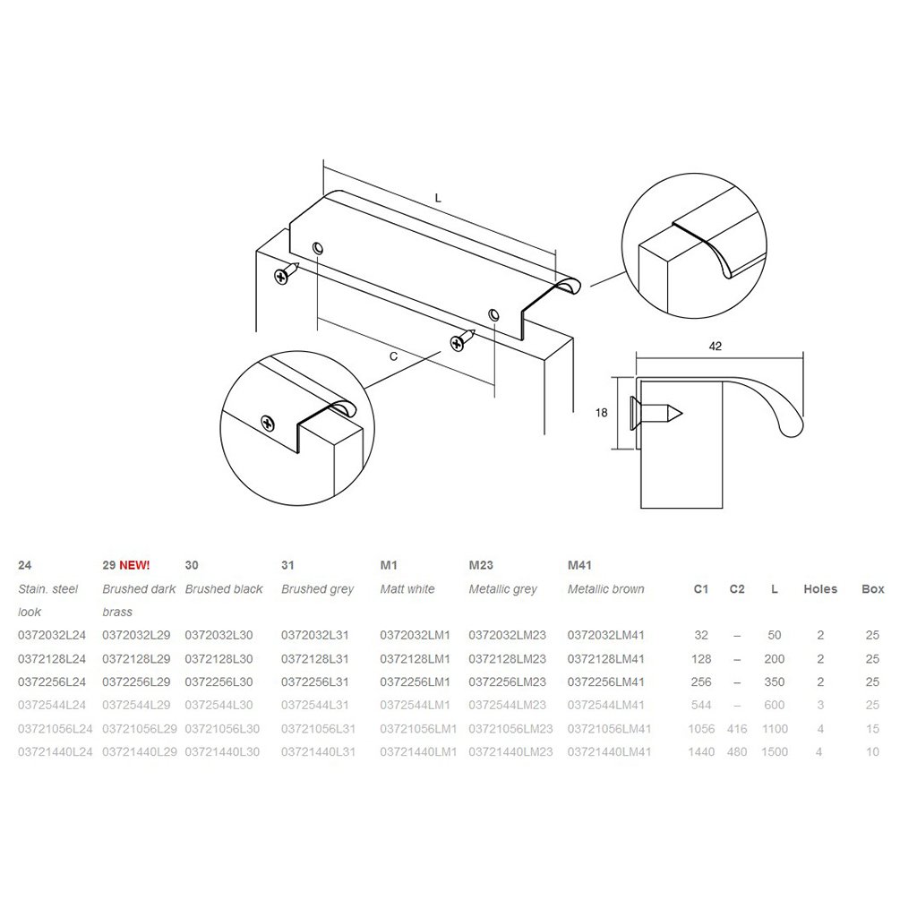Vďaka viacerým dostupným rozmerom sa prispôsobí rôznym šírkam nábytku. Je ideálna pre kuchynské linky a pracovné kuchynské ostrovy. Profilová úchytka ONA je dostupná v nadčasových a univerzálnych prevedeniach: nerezový look, brúsená čierna, brúsená šedá a matná biela. Pre súčasný a trendový vzhľad zvoľte metalickú šedú alebo metalickú hnedú.