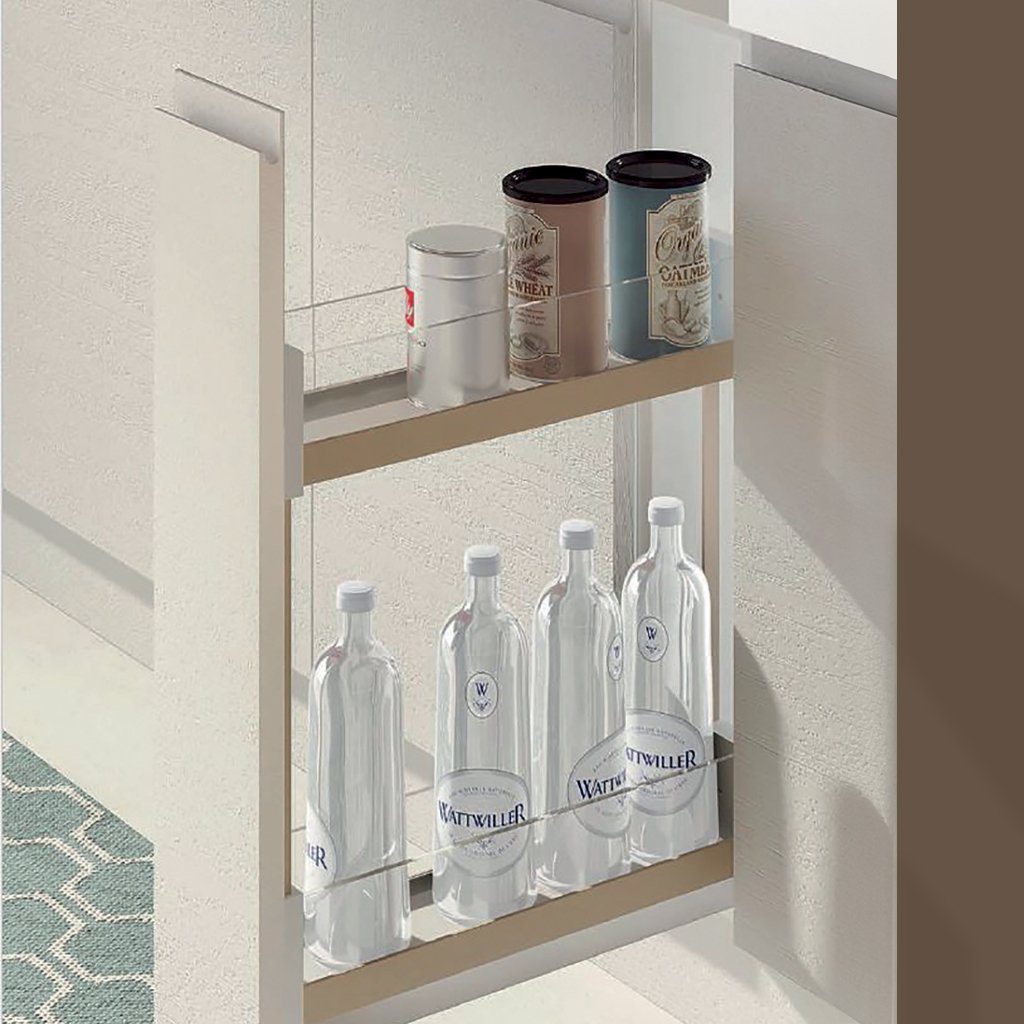 Tento model je vybavený elegantnými čírymi sklenenými bočnicami a pevným sivým rámom a držiakmi. Celovýsuv umožňuje jednoduché ovládanie, zatiaľ čo systém tlmenia zabezpečuje tiché a jemné zatváranie. Nastavenie čela je možné v 3 smeroch, čo zaručuje dokonalé prispôsobenie. Kôš je montovaný na ľavú stenu skrinky, čím optimalizuje využitie priestoru. Ideálne riešenie pre moderné a štýlové kuchyne.