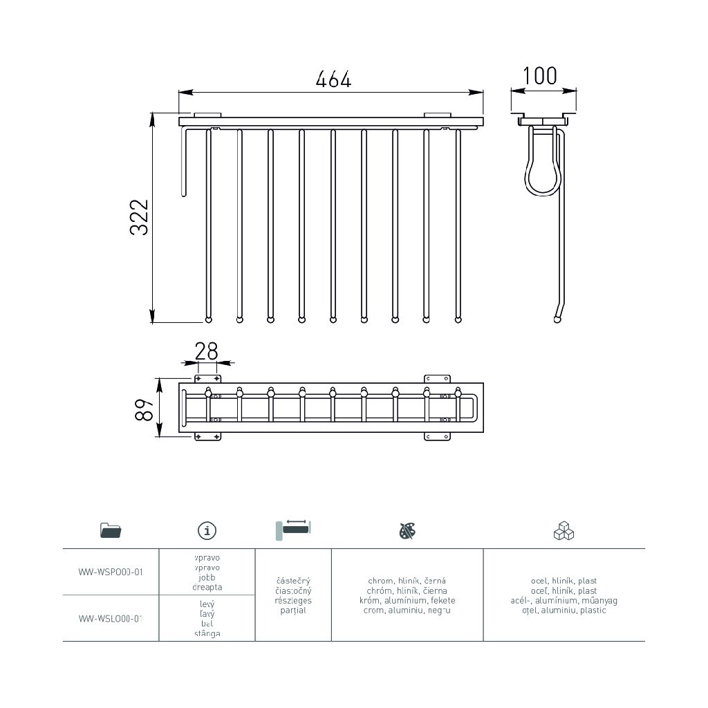 Výsuvný vešiak na nohavice WS, pravostranný, 9 ramien, Chróm