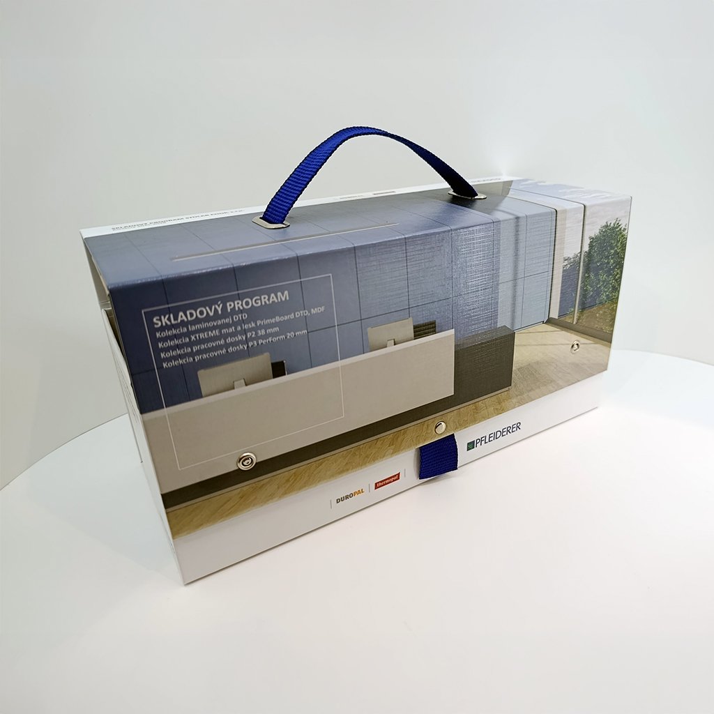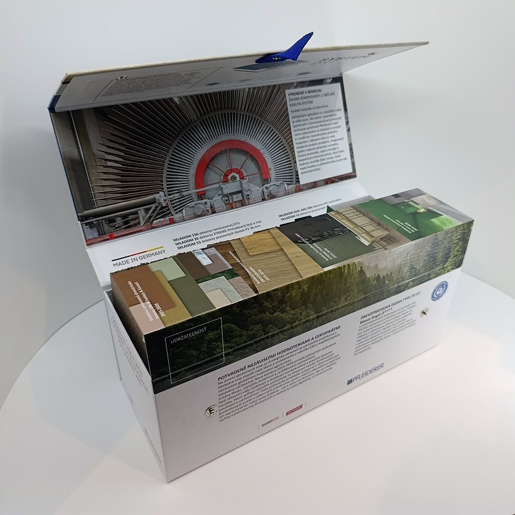 Profesionálny vzorkovník Pfleiderer v praktickej krabici predstavuje kompletný prehľad noviniek a trendov pre roky 2025–2028. Je ideálnym nástrojom pre dizajnérov, architektov, stolárov aj výrobcov nábytku, ktorí chcú svojim klientom prezentovať aktuálne materiály a dekory značky Pfleiderer.